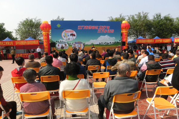 在启动仪式上,恩平市供销社主任吴树强作了讲话,他指出,在春耕时节举办这次“放心农资、农技信息、电商服务”三下乡活动,是深化供销社综合改革的重要内容,是贯彻落实恩平市强农惠农政策的有力举措,恩平市供销社决心以这次活动为契机,进一步在全市范围内掀起放心农资、农技信息、电商服务下乡进村高潮,为农业生产提供优质的服务。活动中,广东省农科院、江门天禾农资公司、江门侨润电商公司负责人分别介绍了种植技术、化肥使用技术以及农村电商业务开展的相关情况。随后,江门市供销社主任郑劲龙宣布 “放心农资、农技信息、电商服务 ”三下乡活动正式启动。