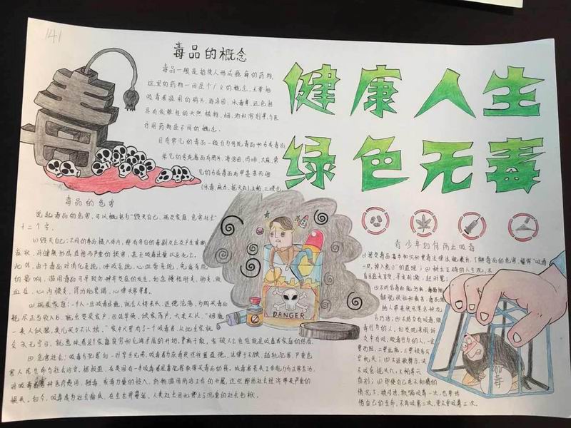 为积极响应国家法制禁毒活动,省财经学校开展了一系列禁毒教育工作与活动。除了开展教育专题活动,省财经学校还举行了主题为“健康人生,绿色无毒”的手抄报比赛。财校学子的艺术气息弥漫到了画纸上,一幅幅栩栩如生的手抄报在各位“大艺术家”的手里展现得淋漓尽致。