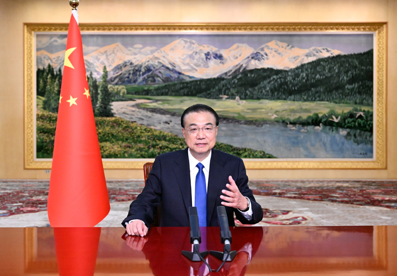 11月28日,国务院总理李克强在第八轮中日企业家和前高官对话会上发表视频致辞。新华社记者 申宏 摄