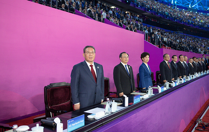 欢快的乐曲声中,李强同亚奥理事会代理主席辛格等步入主席台,向观众挥手致意。