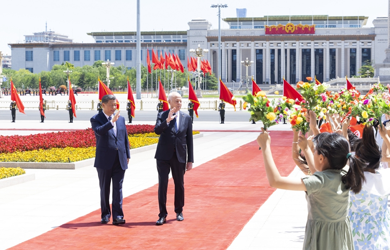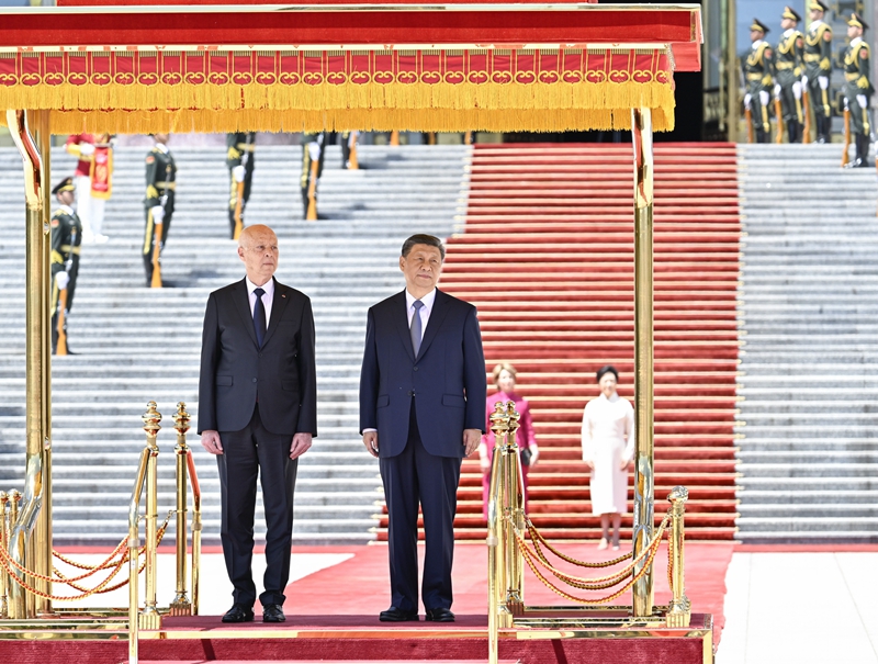 5月31日上午,国家主席习近平在北京人民大会堂同来华国事访问并出席中国-阿拉伯国家合作论坛第十届部长级会议开幕式的突尼斯总统赛义德举行会谈。这是会谈前,习近平在人民大会堂东门外广场为赛义德举行欢迎仪式。新华社记者 翟健岚 摄