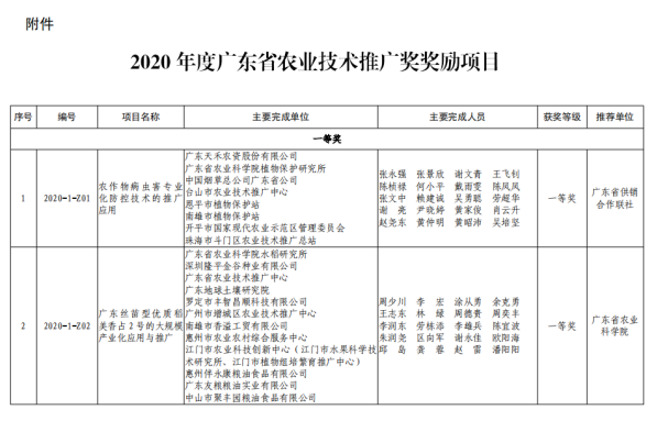 广东省农业技术推广奖是全国第一批设立的省级农业技术推广奖,2020年按照“重推广成效、重服务基层”原则,重点奖励我省在农业技术推广一线做出重要贡献的农业科技人员和单位,加快农业农村科技成果转化应用。此次获奖项目共130项,其中一等奖项目21项,二等奖项目54项,三等奖项目55项。