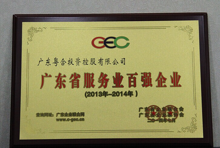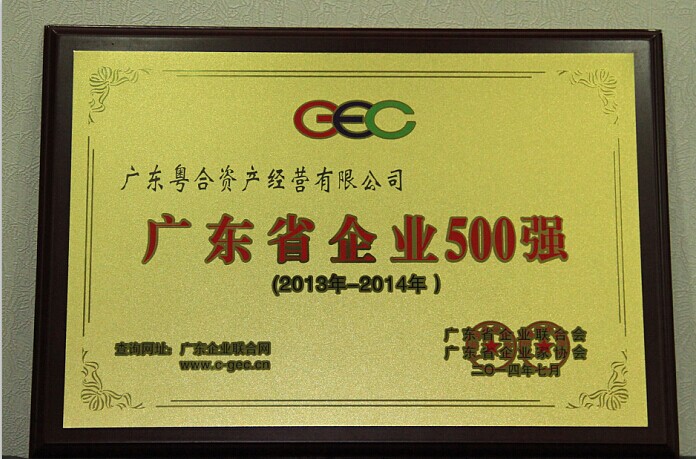 7月25日,2014年广东省企业500强、优秀自主品牌发布会在白云国际会议中心举行。在本次评选活动中,广东粤合资产经营有限公司位列“广东省企业500强”第78位,广东粤合投资控股有限公司位列“广东省服务业百强”第35位。全国人大华侨委员会副主任委员黄华华、省政协副主席梁伟发等领导出席发布会。粤合控股公司副总经理龙江代表粤合公司和粤合投资控股公司参加授牌仪式。
