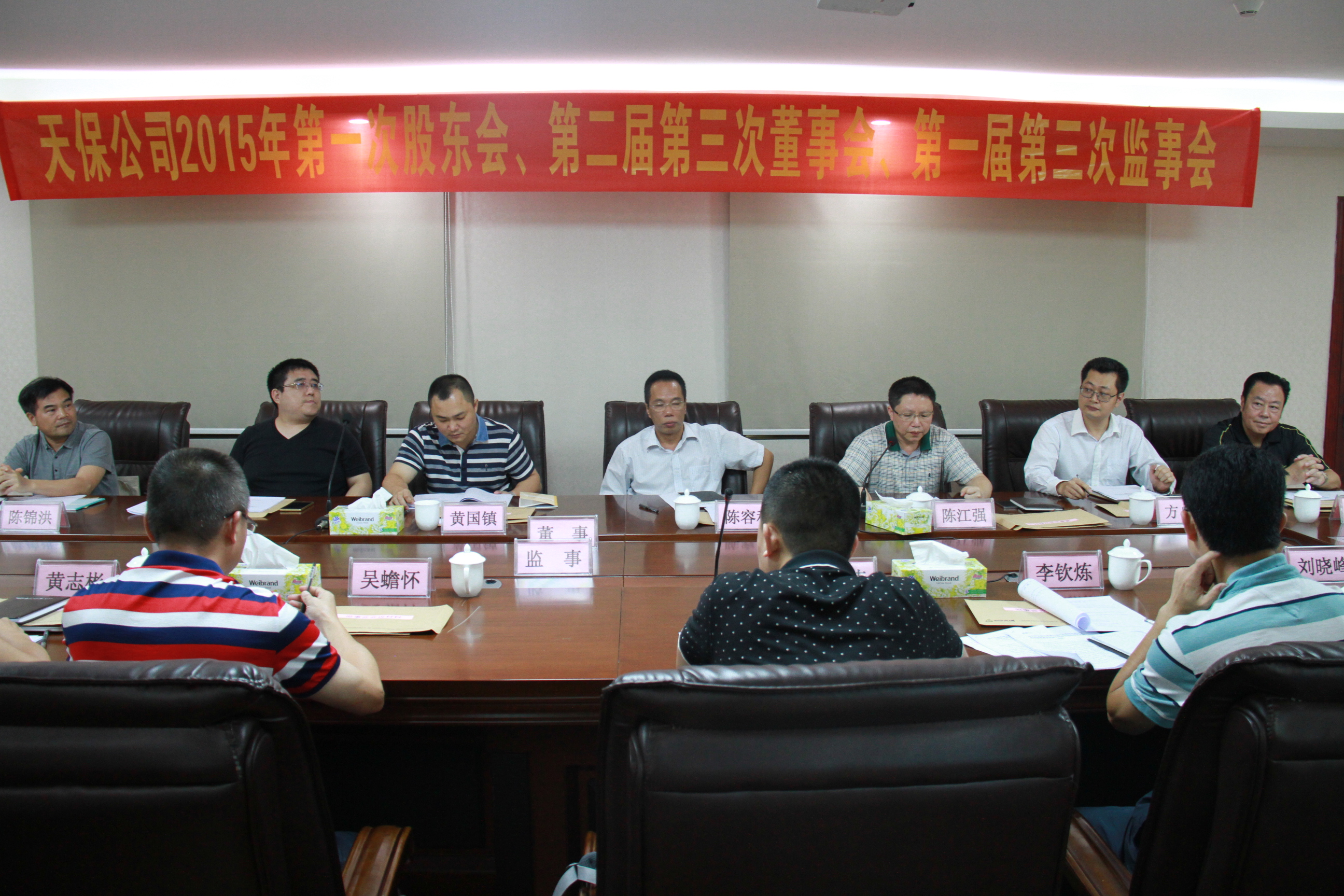 2015年9月23日下午,天保公司召开2015年第一次股东会,并同时套开第二届第三次董事会、第一届第三次监事会。省社党组成员、理事会副主任陈容秋、各股东代表、董事会成员、监事会成员、公司高管和法律顾问参加了会议。