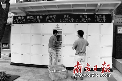 配送人员把新鲜农副产品放进小区智能保鲜柜里,市民凭密码就可以打开保鲜柜,拿到购买的农副产品。照片由肇庆市供销社提供 |