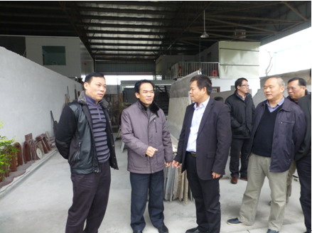 图为陈栋副主任(左二)和鹤山市副市长陈文(左一)在沙坪综合建材市场实地调研