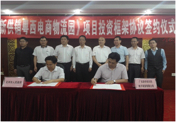 新供销公司董事长黄庆福与化州市政府副市长巫卫国代表各自双方签订了《广东新供销粤西电商物流园项目投资框架协议》。茂名市供销社、化州市政府有关职能部门、省供销社综合业务处以及公司相关负责人参加了签约仪式。