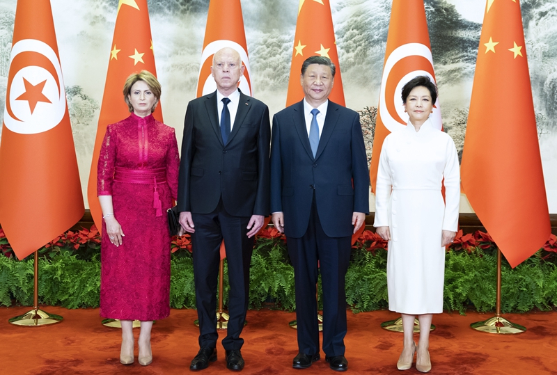 5月31日上午,国家主席习近平在北京人民大会堂同来华国事访问并出席中国-阿拉伯国家合作论坛第十届部长级会议开幕式的突尼斯总统赛义德举行会谈。这是会谈前,习近平和夫人彭丽媛在人民大会堂东门外广场为赛义德和夫人伊什拉芙举行欢迎仪式。新华社记者 殷博古 摄