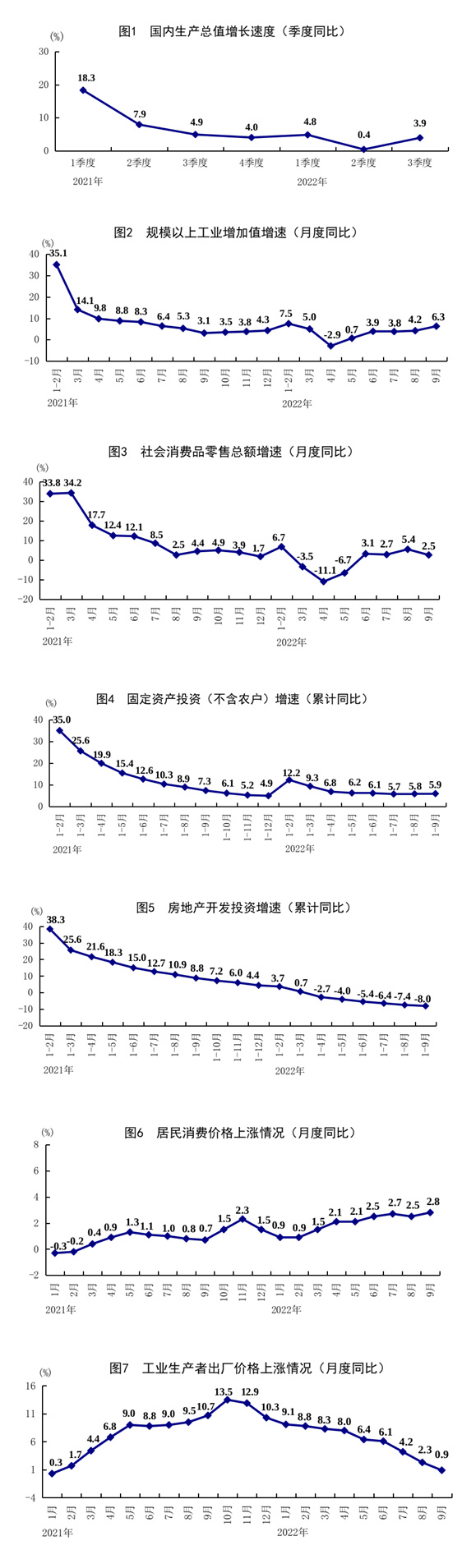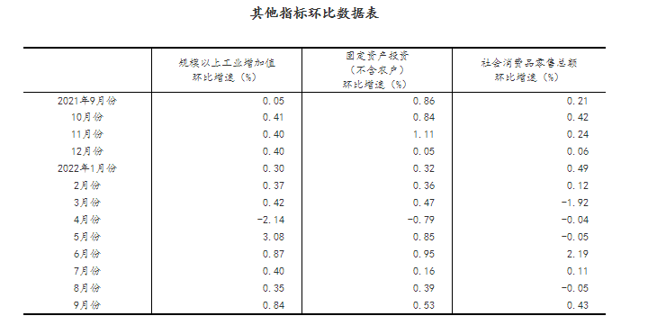 (2)根据季节调整模型自动修正结果,对近一年来各期国内生产总值、规模以上工业增加值、固定资产投资(不含农户)、社会消费品零售总额环比增速进行修订。修订结果及2022年三季度GDP环比数据、2022年9月份其他指标环比数据如下: