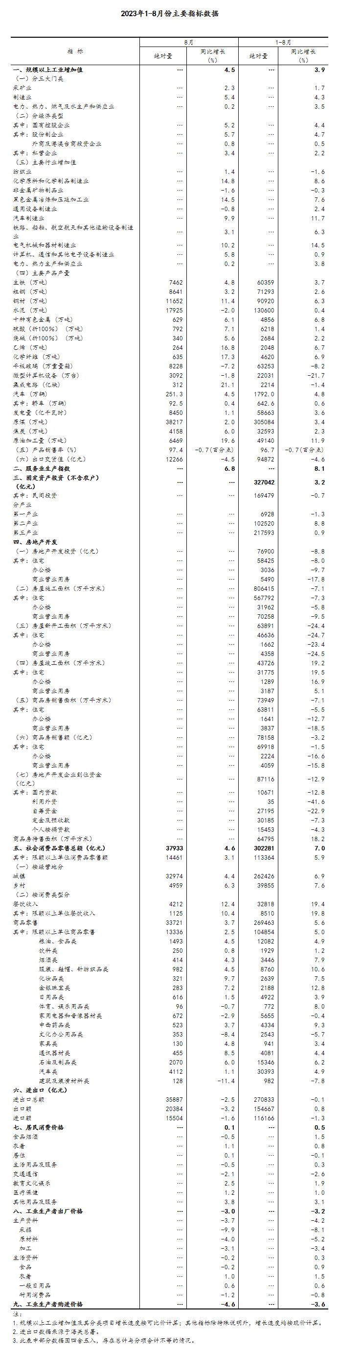 总的来看,8月份,主要指标边际改善,国民经济恢复向好,高质量发展扎实推进,积极因素累积增多。但也要看到,外部不稳定不确定因素依然较多,国内需求仍显不足,经济恢复向好基础仍需巩固。下阶段,要坚持以习近平新时代中国特色社会主义思想为指导,坚持稳中求进工作总基调,聚焦推动高质量发展这一首要任务,围绕稳增长、稳就业、防风险等,加快已出台政策举措落地见效,不断推动经济运行持续好转、内生动力持续增强、社会预期持续改善、风险隐患持续化解,推动经济实现质的有效提升和量的合理增长。