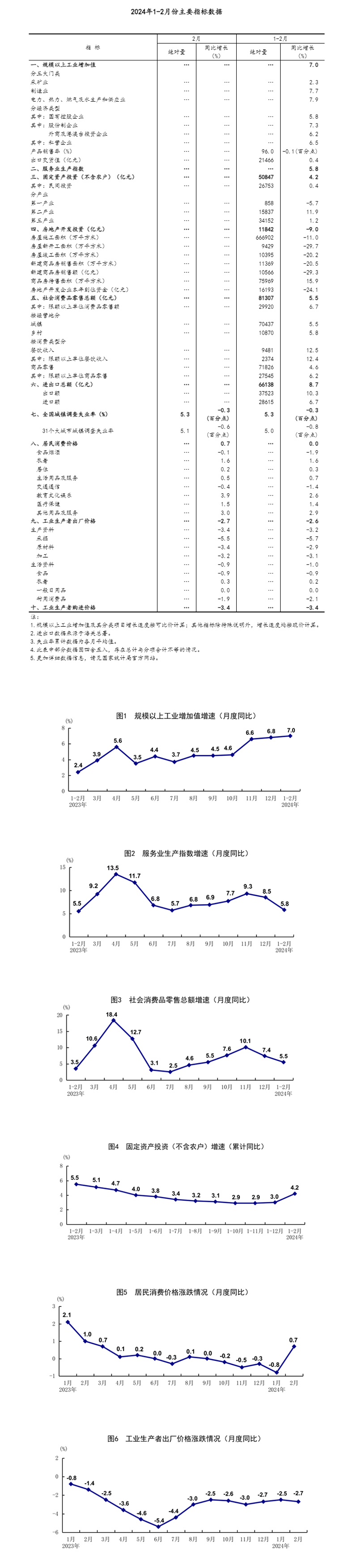 1—2月份,全国规模以上工业增加值同比增长7.0%,比上年12月份加快0.2个百分点。分三大门类看,采矿业增加值同比增长2.3%,制造业增长7.7%,电力、热力、燃气及水生产和供应业增长7.9%。消费品制造业增加值增长4.7%,比上年12月份加快4.4个百分点;高技术制造业增加值增长7.5%,加快1.1个百分点。分经济类型看,国有控股企业增加值增长5.8%;股份制企业增长7.3%,外商及港澳台投资企业增长6.2%;私营企业增长6.5%。分产品看,3D打印设备、充电桩、电子元件产品产量同比分别增长49.5%、41.8%、41.5%。从环比看,2月份规模以上工业增加值比上月增长0.56%。2月份,制造业采购经理指数为49.1%,企业生产经营活动预期指数为54.2%。