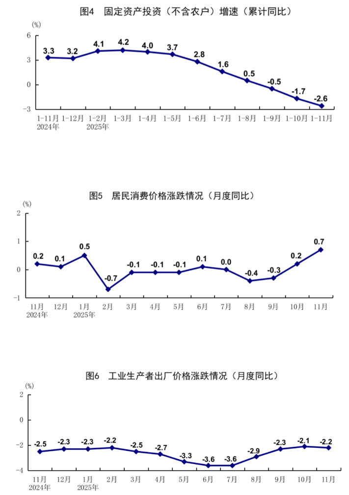 11月份,全国工业生产者出厂价格同比下降2.2%,环比上涨0.1%;全国工业生产者购进价格同比下降2.5%,环比上涨0.1%。1—11月份,全国工业生产者出厂价格和购进价格同比分别下降2.7%、3.1%。