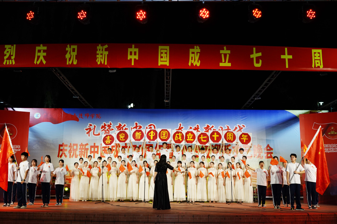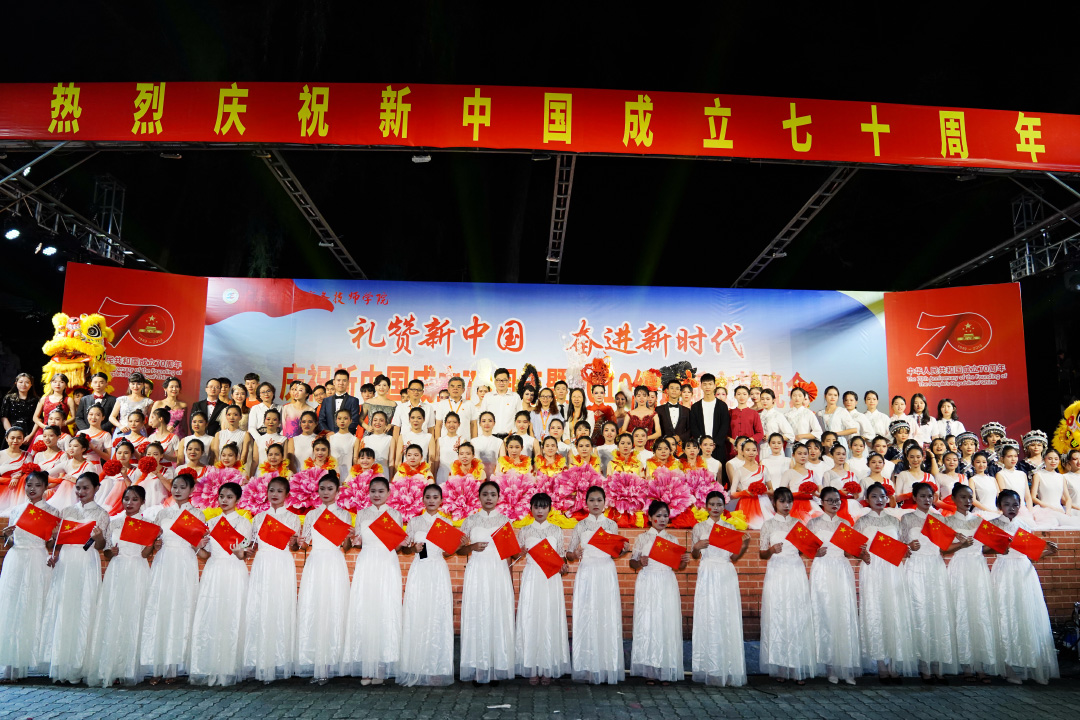 晚会在极富广东文化特色的舞狮表演“龙腾虎跃庆国庆”中拉开帷幕。接下来歌唱、舞蹈、武术、朗诵、花样跳绳、茶艺、T台秀等精彩节目轮番登场,充分展示了我校师生的多才多艺。夜晚中绚丽的舞台灯光如梦似幻,与月色交相辉映、唯美动人。最后的歌舞表演“我和我的祖国”气势磅礴、情感充沛,将晚会的气氛推向了最高潮,也为晚会画下了一个圆满的句号。整场晚会精彩纷呈,令人目不暇接,为喜迎国庆奉献了一场喜庆、祥和、欢乐、精彩的视听盛宴。