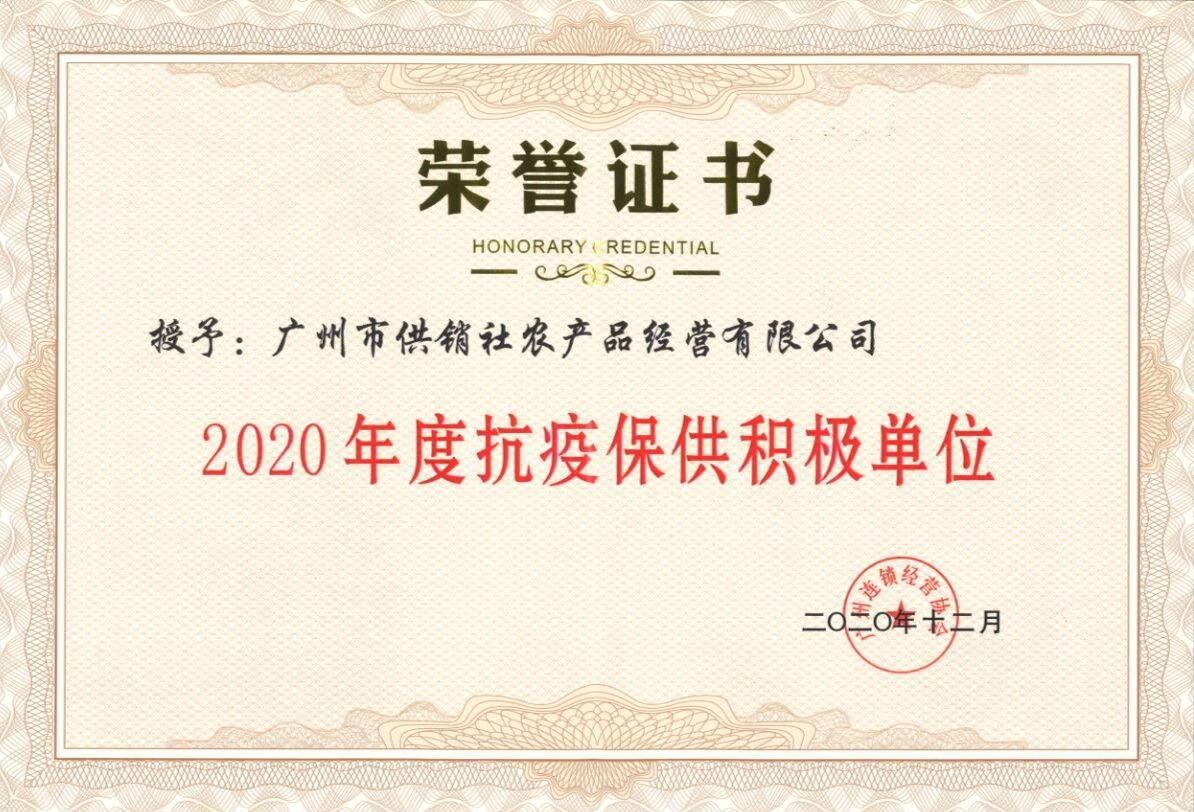 2020年12月29日下午,广州市供销社农产品经营有限公司作为会员单位出席参加了广州连锁经营协会五届四次会员大会暨庆祝协会成立25周年晚会。会上广州市供销社农产品经营有限公司荣获了“2020年度广州市优秀企业”和“2020年度抗疫保供积极单位”称号。