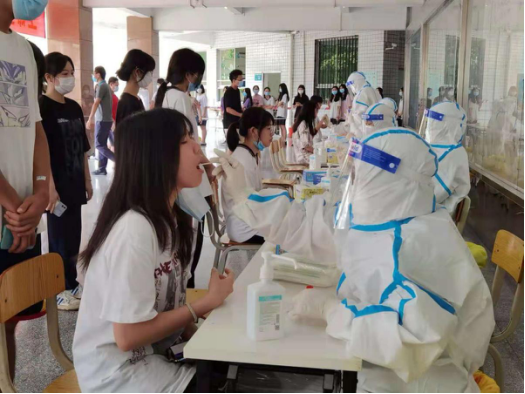 在检测现场,身穿防护服的医护人员一丝不苟地为师生们进行采集咽拭子。师生们全程佩戴口罩,按照志愿者的指引,保持1米安全距离,每10人一组,有条不紊进行登记、采样。学生以班级为单位在教学楼一楼篮球场前排队等候,分批受检。为了提高检测效率,师生们提前一天就按照要求扫描核酸检测葵花码,在手机上进行个人信息的录入,当天便快速将已保存的二维码截图给医护人员扫描核实登记。经过2个多小时,全校近3000名师生高效完成核酸检测。