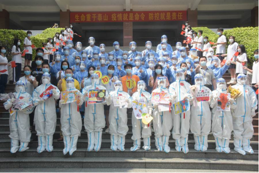 采集结束后,电子商务系的学生代表还自发向医护人员献上鲜花,送上亲手制作的写满如“坚定信心、同舟共济、共同抗疫!”“中国加油!广东加油!佛山加油!”等标语的手工作品,齐声高喊:“谢谢你们,你们辛苦了!”在《我的祖国》嘹亮歌声中,省财经学校领导和志愿者们与全体医护人员愉快合影留念。