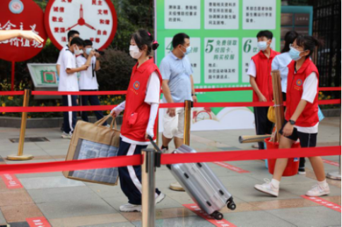 按照防疫要求,家长止步校门口,孩子自己进入学校。在学校门口,穿着红马夹的青年志愿者,热情上前迎接,帮忙提行李,引导到各班接待站。新班主任在接待站耐心等候他们的到来,老生志愿者认真核对、登记好新同学的入学资料,填写住宿通知单,拿行李、找宿舍、办水卡、买校服、反诈骗下载等等,全程引导、帮办。“这里的老师很亲和,师兄师姐很友好、很优秀,第一次离家出远门的我感到有一种家的温暖。”由于天气酷热,很多老师、志愿者们汗流浃背,连水都没空喝上一口,看到老师、志愿者们忙前忙后,新同学无不感动地说。家长们目送孩子进校门后,也感慨地说:“财经学校安排得很周到,孩子在这样的环境学习生活,我们也放心了。”在老师、师兄师姐的热情感召下,原本心情忐忑的新同学一下子找到了归属感。