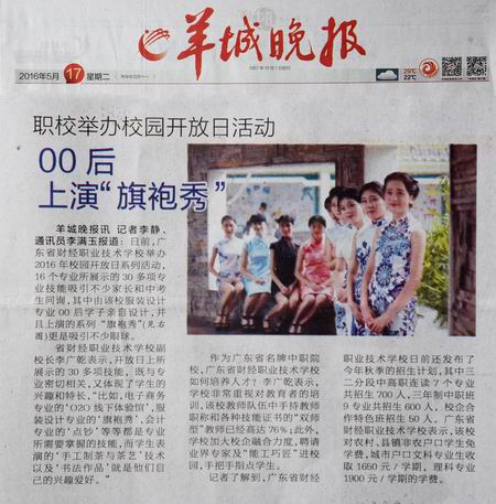 羊城晚报讯 记者李静、通讯员李满玉报道:日前,广东省财经职业技术学校举办2016年校园开放日系列活动,16个专业所展示的30多项专业技能吸引不少家长和中考生问询,其中由该校服装设计专业00后学子亲自设计,并且上演的系列“旗袍秀”(见右图)更是吸引不少眼球。