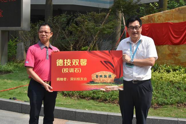 这次深圳校友会、佛山校友会分别向母校捐赠校训石和香樟树,不仅给校园增添了一道亮丽的文化风景,更具有深远的文化教育意义;不仅是对校友文化的永久纪念,更是一部生动的教材。深圳校友会校友捐赠的校训石“德技双馨”,特邀请中国水墨艺术研究院首席研究员、中国美术家协会理事、评审委员会成员李耀林先生题写。校训“德技双馨”,就是要激励全校师生践行和追求品德与技艺“双馨”的完美境界,引领教师成为师德高尚、技艺高超的教育者,教导学生成为品行优秀、技能精湛的建设者,是学校教育精神的核心内涵和师生追求的价值标尺。佛山校友会捐赠的香樟树,寓意着母校“十年树木,百年树人”的深刻教育理念,激励在校学子立志成才,长成参天大树,也象征着校友与母校的情谊枝繁叶茂、源远流长。