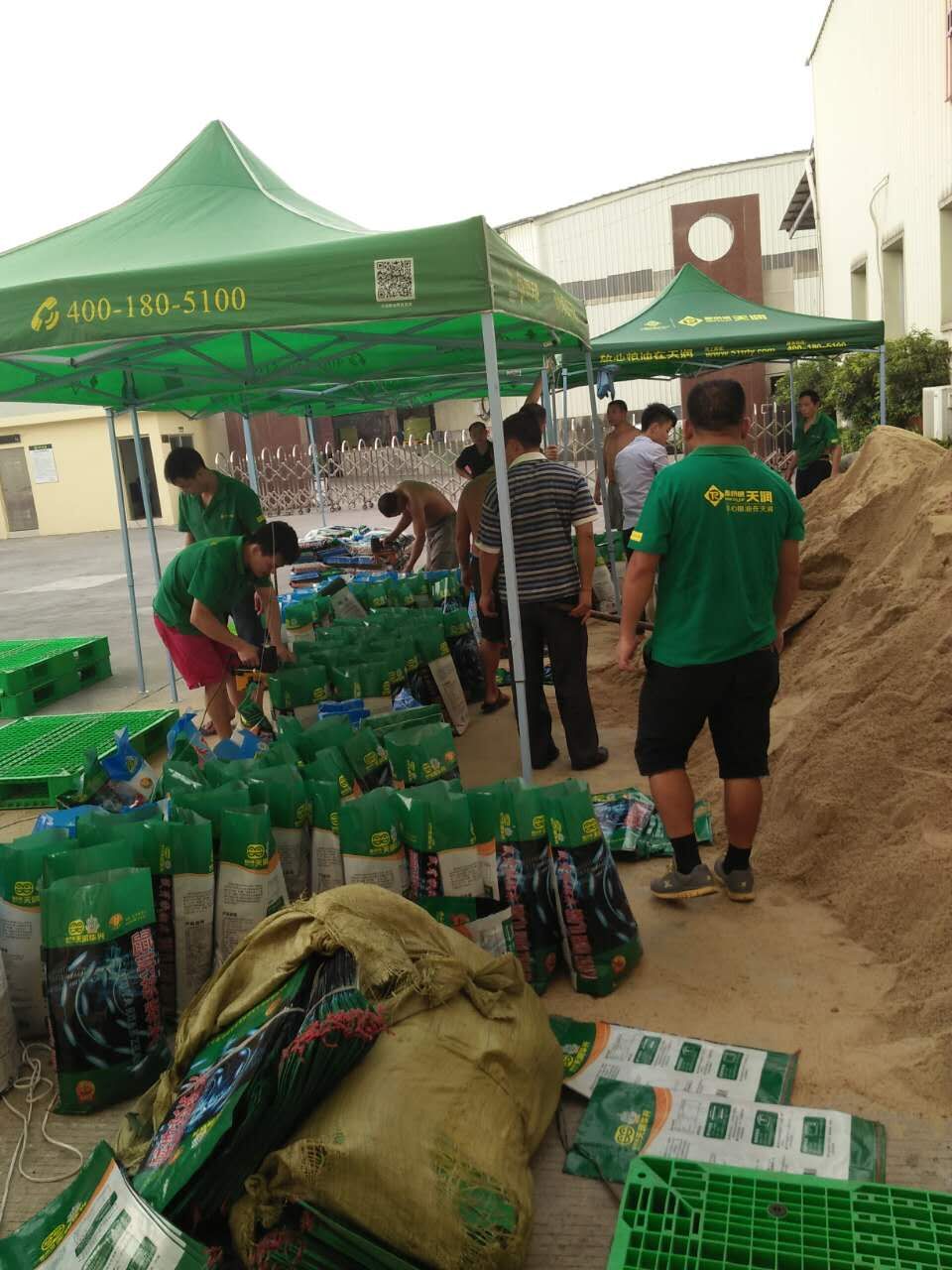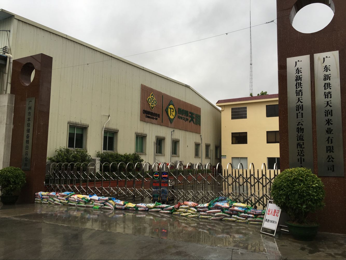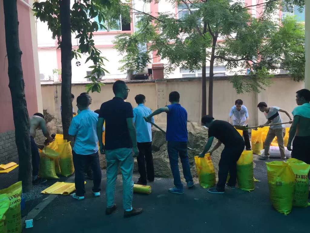 在公司领导班子的带领下,总部所有男员工全部抽调到河沙仓库及白云仓库分装沙包,在每个仓库门前筑起沙包墙,防止雨水倒灌,并对仓库门窗做好加固工作。