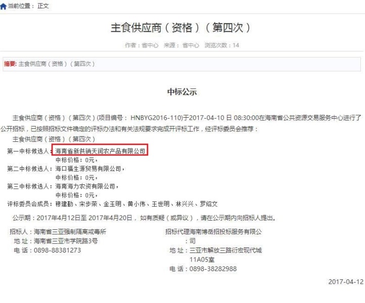 4月13日,海南省新供销天润农产品有限公司成功中标海南省三亚强制隔离戒毒所主食供应商资格项目,成为项目主食供应商之一。