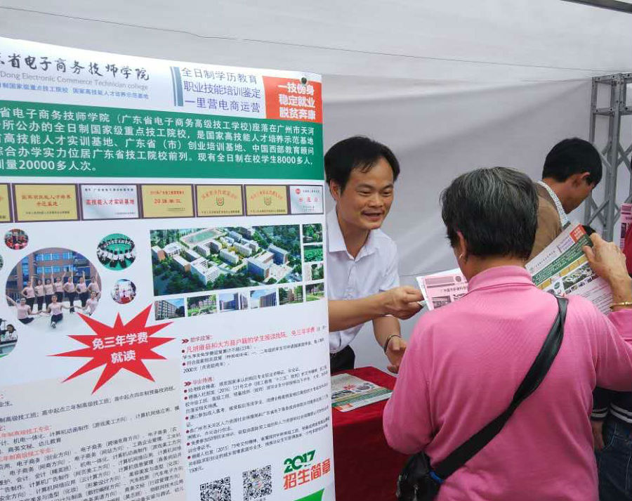 贵州省纳雍县和大方县是广州市天河区对口帮扶点,为推进和落实帮扶工作,天河区人社局此次组织广州富力地产股份有限公司、光宝电子有限公司等17家企业及我院的教育、创业项目,进行现场招聘和项目带动。省电子商务技师学院作为帮扶队伍中唯一的院校,提供“互联网+高技能人才培养+‘一里营’农特产品电商服务+实用技能培训”的方式进行对口帮扶,利用自主创建的一里营农产品销售专家平台,免费帮助农户进行网店建设、农产品拍摄及美工处理、农产品线上运营推广销售,实现“山货”走出大山,销往全国各地;同时,两县贫困家庭学生还可免学费到省电子商务技师学院就读,实现“培养一人,致富一家”;省电子商务技师学院还为当地农民提供实用技能培训服务,实现“一技傍身,稳定就业,脱贫奔康”的目的。
