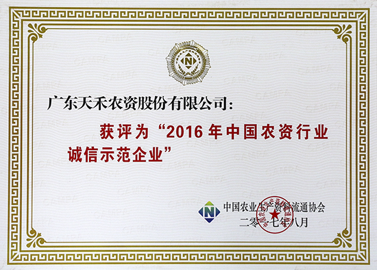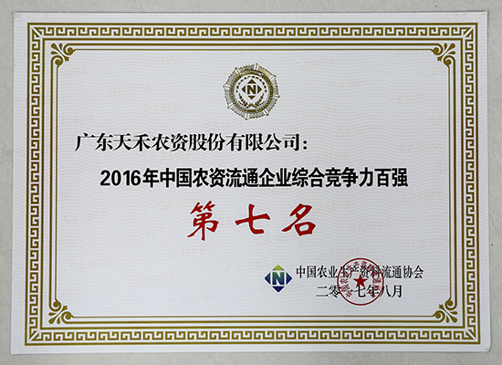 广东天禾排名“2016年中国农资流通企业综合竞争力百强”第七名,连续三年位列第七名。同时,荣获2016年中国农资行业诚信示范企业。