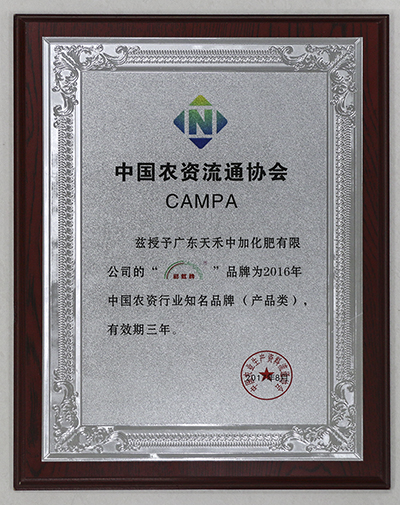 广东天禾“GDTIANHE+图形”品牌被评为2016年中国农资行业知名品牌(服务类),广东天禾中加化肥有限公司“彩虹”品牌被评为2016年中国农资行业知名品牌(产品类),有效期三年。