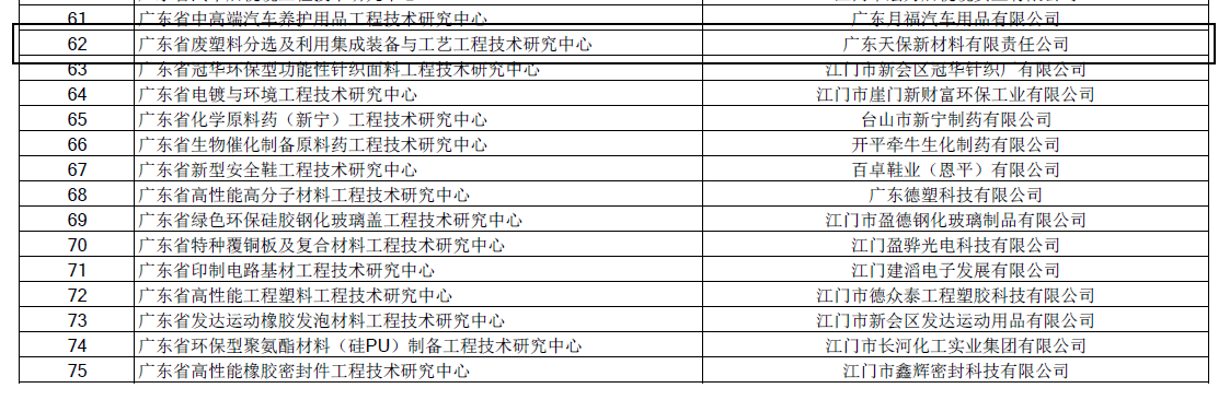 2017年9月,由广东天保新材料有限责任公司组建的“广东省废塑料分选及利用集成装备与工艺工程技术研究中心”成功通过广东省科技厅认定。目前,废塑料分选及利用集成装备与工艺工程技术研究在国内尚属空白,此次成功认定对解决国内废旧塑料回收及循环利用的相关装备与工艺集成,对自动化、智能化、高效化的技术研究与开发,以及对废塑料产业的转型升级等有着重要的现实意义。广东天保再生资源集团将以省级工程技术中心为基点,以技术创新为核心,以建立开放、协作、多学科交叉的国内首家大规模废塑料分选及利用集成设备与工艺工程技术研究中心为契机,致力于为本领域科研、技术人员提供平台,为行业转型升级和创新发展提供集成装备及工艺技术咨询、服务和指导,为行业技术创新、技术服务、技术推广及成果转化提供研究和示范。并努力将此工程中心打造成为在本领域创新驱动、提质增效、引领示范等方面具有一定影响力的科研与产业化应用大平台。