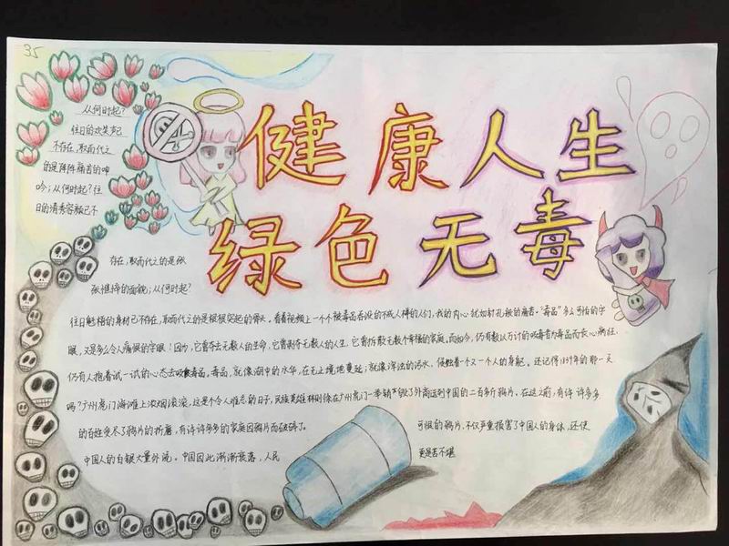 为积极响应国家法制禁毒活动,省财经学校开展了一系列禁毒教育工作与活动。除了开展教育专题活动,省财经学校还举行了主题为“健康人生,绿色无毒”的手抄报比赛。财校学子的艺术气息弥漫到了画纸上,一幅幅栩栩如生的手抄报在各位“大艺术家”的手里展现得淋漓尽致。