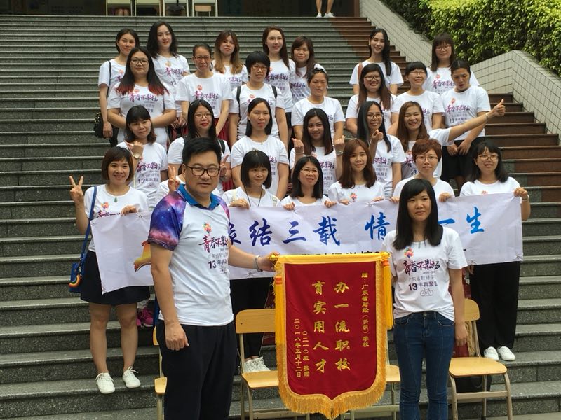 当年的青涩少年离开学校已有13个年头,这次回校探访,自是感慨万千。当年的班主任刘茂芳、邓影一路陪同介绍:从大门前的文化广场,到校史展览室;从办公楼,文化长廊到宿舍楼和标准化运动场,校友们看到现代化的教学设施,浓郁的文化氛围,特别是各系新建的实训室,更是抚今追昔,难抑激情。随后,在班主任的引导下,同学们回到当年的404课室召开座谈会,播放了由刘茂芳老师精心制作的反映同学当年生活学习、介绍学校今日壮大发展情况的视频,回味当年,在幸福的回忆中欢声笑语,畅所欲言,分享了各自的生活与感受。而通过一些小游戏,更加拉近了彼此之间距离,体验到学校的新的文化底蕴。最后,该毕业班长将一面写有“办一流职校 育实用人才”的锦旗赠送给学校,表达了她们对母校的深深祝福和期待,钟劲东代表学校接受了锦旗。座谈会结束后,全体人员到运动场合影留念,浓浓的师生情谊在不断地延伸着。