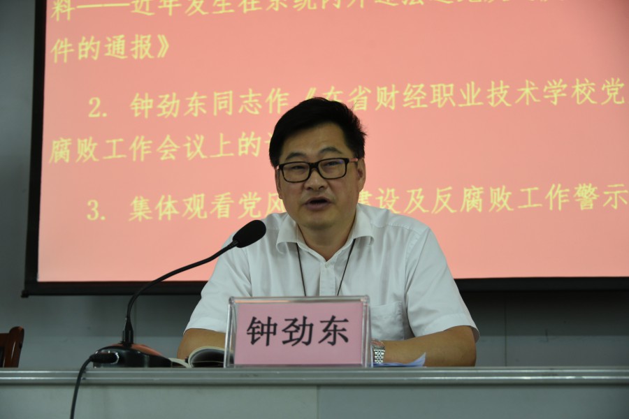 6月5日上午,省财经学校2018年度党风廉政建设与反腐败工作会议在办公楼五楼会议室召开。党委书记、校长钟劲东在会上作题为《在省财经学校党风廉政建设及反腐败工作会议上的讲话》。纪委书记、副校长周永生在会上宣读省社党组编制的《以案为鉴警示教育材料-近年发生在系统内外违法违纪及违反中央八项规定精神案件的通报》。