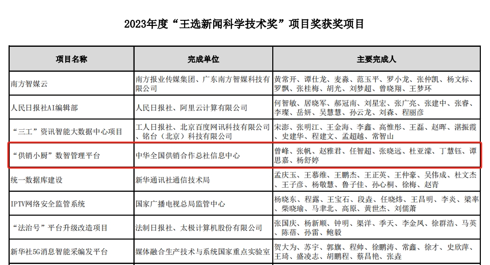 10月8日,由中国新闻技术工作者联合会主办的2023 年度“王选新闻科学技术奖”评选结果正式公布,中华全国供销合作总社信息中心“供销小厨”数智管理平台项目获三等奖。