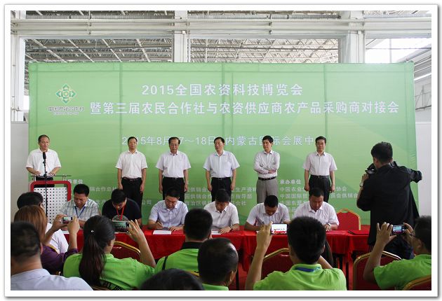 8月17日至18日,由中华全国供销合作总社指导,总社农资局、合作指导部与内蒙古自治区供销合作社联合社联合主办,内蒙古自治区农牧业厅支持,内蒙古农牧业生产资料股份有限公司、中农集团控股股份有限公司协办,中国农业生产资料流通协会、中国东盟农资商会等有关单位共同承办的“2015全国农资科技博览会暨第三届农民合作社与农资供应商农产品采购商对接会”在内蒙古自治区呼和浩特市拉开帷幕。总社理事会副主任骆琳,第十二届全国政协委员、总社原党组成员、理事会副主任、中国农业生产资料流通协会会长顾国新,内蒙古自治区人民政府副主席王玉明出席开幕式及签约仪式。