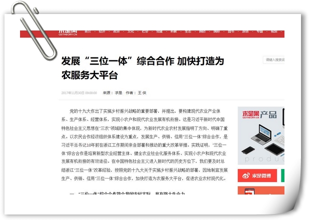党的十九大作出了实施乡村振兴战略的重要部署,并提出,要构建现代农业产业体系、生产体系、经营体系,实现小农户和现代农业发展有机衔接。这是习近平新时代中国特色社会主义思想在“三农”领域的集中体现,为新时代农业农村发展指明了方向、明确了重点。以农民合作经济组织体系建设为重点,发展生产、供销、信用“三位一体”综合合作,是习近平总书记10年前在浙江工作期间亲自部署和推动的重大改革举措。实践证明,“三位一体”综合合作是培育新型农业经营主体、健全农业社会化服务体系、实现小农户和现代农业发展有机衔接的有效途径。在中国特色社会主义进入新时代的历史方位下,我们要及时总结浙江“三位一体”改革经验,按照党的十九大关于实施乡村振兴战略的部署,因地制宜发展生产、供销、信用“三位一体”综合合作,加快打造为农服务大平台,促进农业农村现代化。